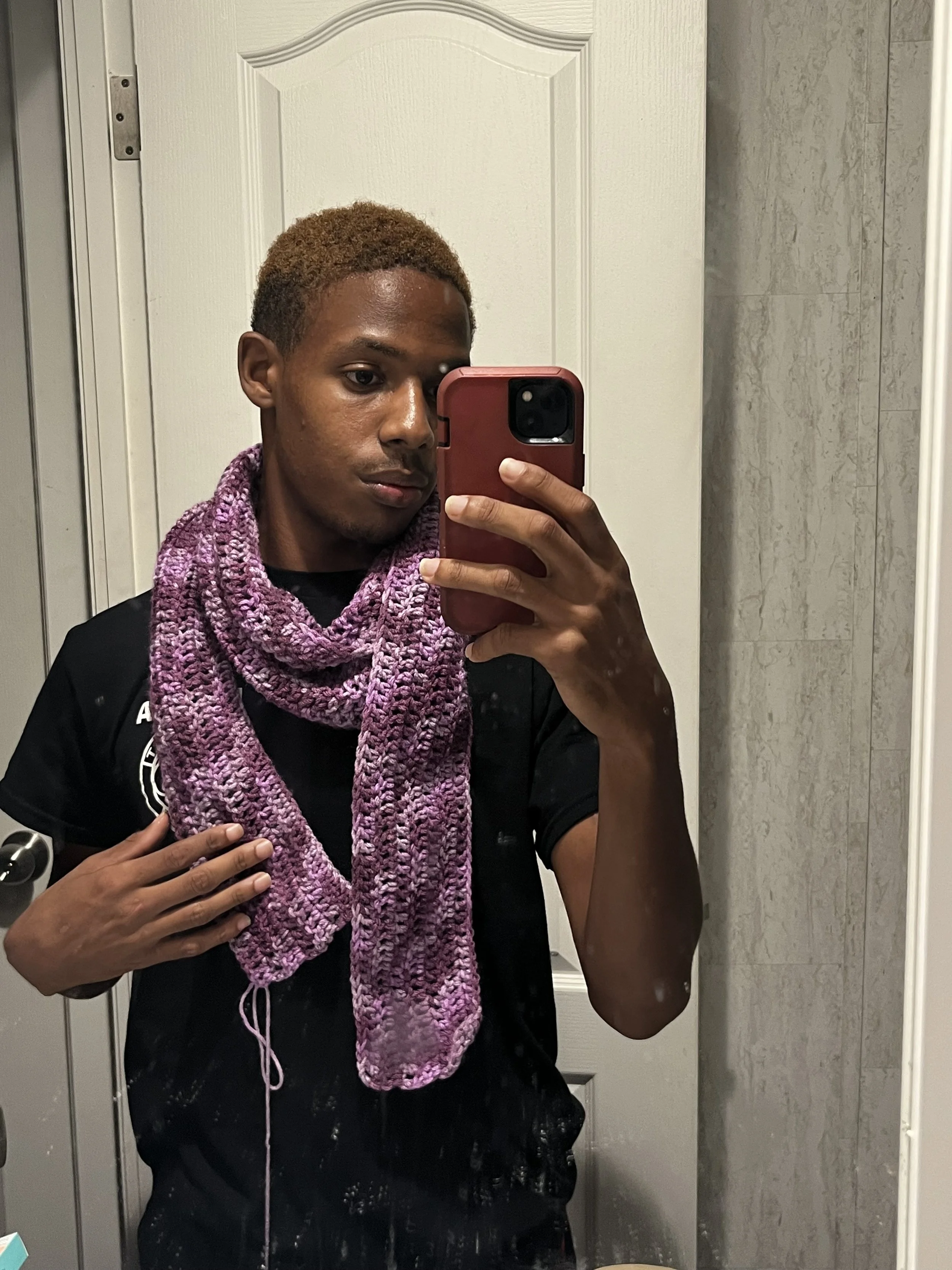 My name is Marquise Snead-Gray. I am creative, crocheting, clothing designing. I love making different outfits in my local area. People love seeing a young man crocheting. A lot of people don’t see younger people crocheting because it’s considered a dead trend, but I am certainly going to bring it back alive and in style. My homemade creations are warm, loving, and made with a lot of care.